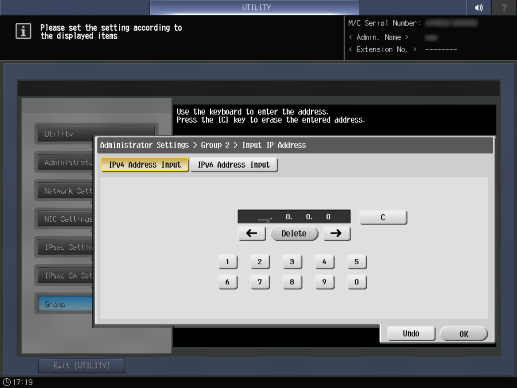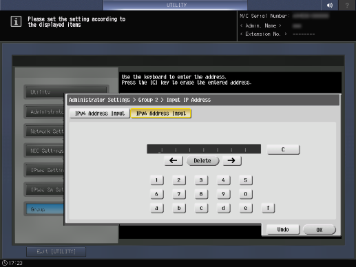 Screen access | Control panel - Utility/Counter - [Administrator Setting] - [Network Setting] - [NIC Settings] - [TCP/IP Settings] - [IPsec Settings] - [IPsec Settings] - [IPsec SA Settings] - [Edit] | ||