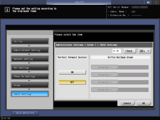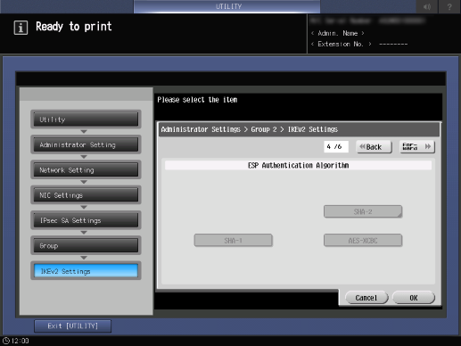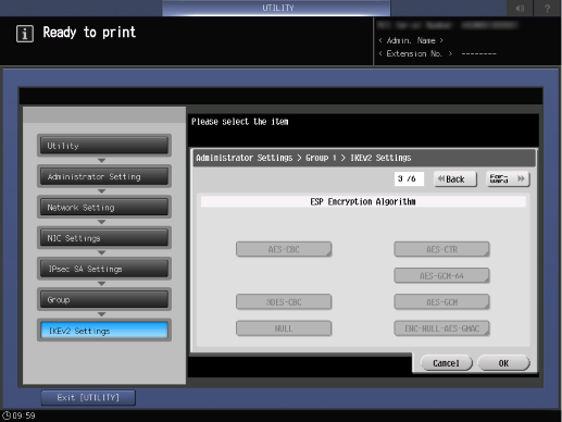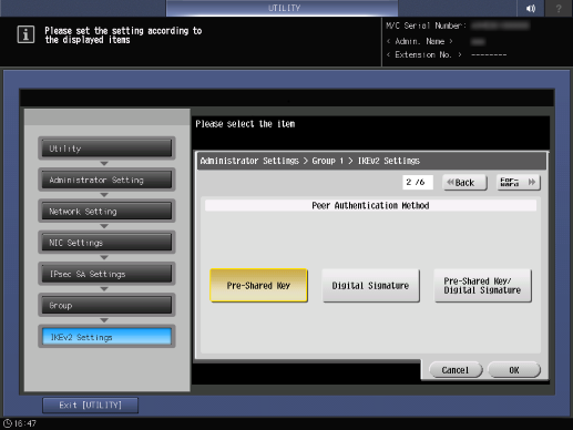 Control panel - Utility/Counter - [Administrator Setting] - [Network Setting] - [NIC Settings] - [TCP/IP Settings] - [IPsec Settings] - [IPsec Settings] - [IPsec SA Settings] - [Edit] - [IKEv2]