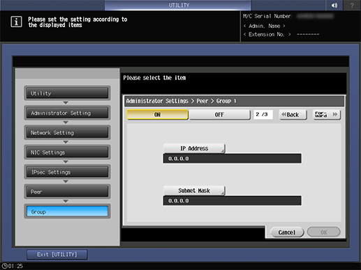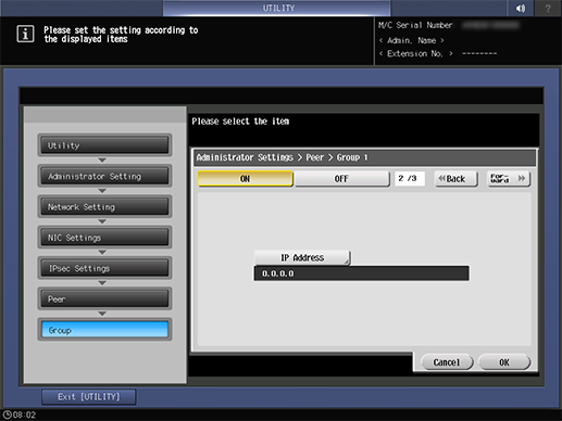 Screen access | Control panel - Utility/Counter - [Administrator Setting] - [Network Setting] - [NIC Settings] - [TCP/IP Settings] - [IPsec Settings] - [IPsec Settings] - [Peer] - Select one group - [Edit] | |||