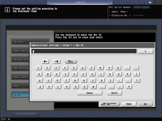 Screen access | Control panel - Utility/Counter - [Administrator Setting] - [Network Setting] - [NIC Settings] - [TCP/IP Settings] - [IPsec Settings] - [IPsec Settings] - [Peer] - Select one group - [Edit] | ||