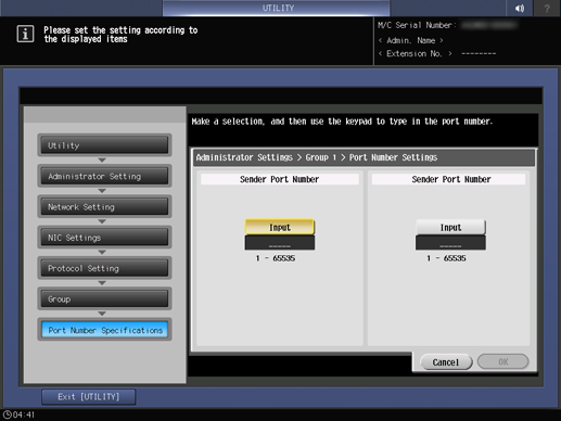 Screen access | Control panel - Utility/Counter - [Administrator Setting] - [Network Setting] - [NIC Settings] - [TCP/IP Settings] - [IPsec Settings] - [IPsec Settings] - [Protocol Setting] - Select one group - [Edit] - [Port Number] | ||
