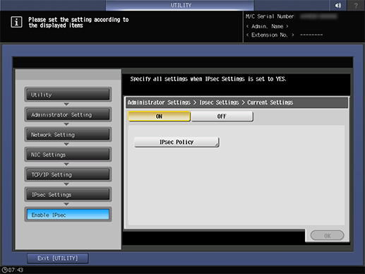 Control panel - Utility/Counter - [Administrator Setting] - [Network Setting] - [NIC Settings] - [TCP/IP Settings] - [IPsec Settings] - [Enable IPsec]