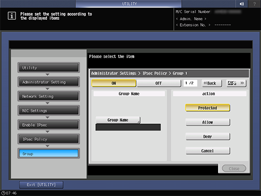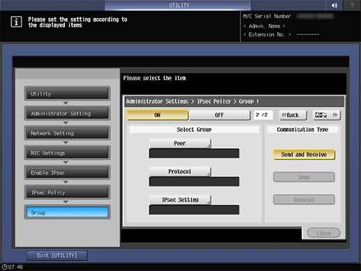 Control panel - Utility/Counter - [Administrator Setting] - [Network Setting] - [NIC Settings] - [TCP/IP Settings] - [IPsec Settings] - [Enable IPsec] - [IPsec Policy] - Select one group - [Edit]