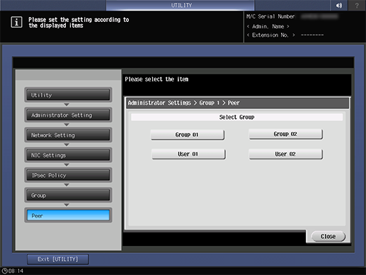 Screen access | Control panel - Utility/Counter - [Administrator Setting] - [Network Setting] - [NIC Settings] - [TCP/IP Settings] - [IPsec Settings] - [Enable IPsec] - [IPsec Policy] - Select one group - [Edit] - [Peer] | ||