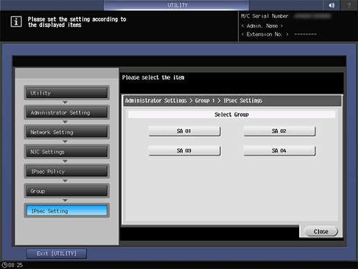 Screen access | Control panel - Utility/Counter - [Administrator Setting] - [Network Setting] - [NIC Settings] - [TCP/IP Settings] - [IPsec Settings] - [Enable IPsec] - [IPsec Policy] - Select one group - [Edit] - [IPsec Setting] | ||