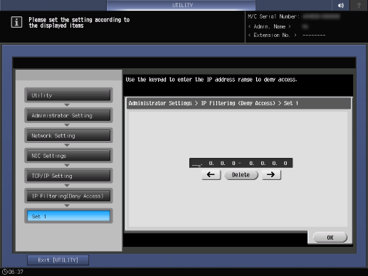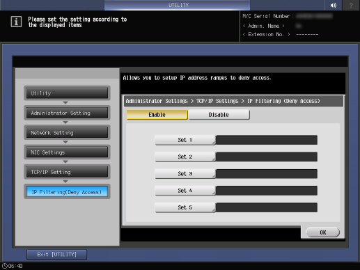 Screen access | Control panel - Utility/Counter - [Administrator Setting] - [Network Setting] - [NIC Settings] - [TCP/IP Settings] - [IP Filtering (Deny Access)] | ||