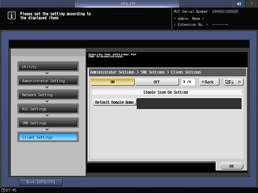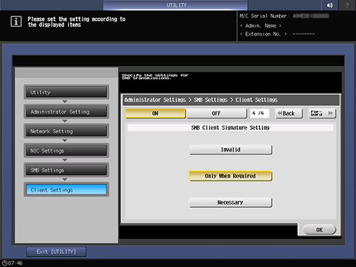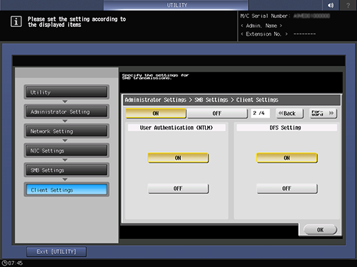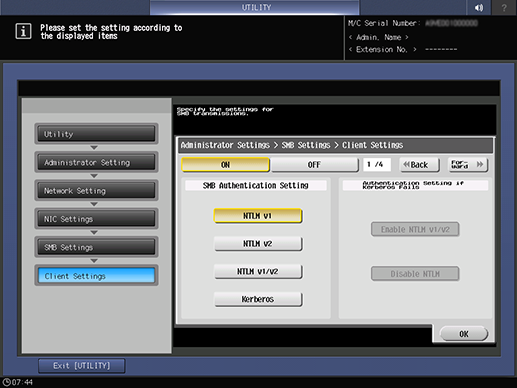 Control panel - Utility/Counter - [Administrator Setting] - [Network Setting] - [NIC Settings] - [SMB Settings] - [Client Settings]