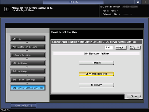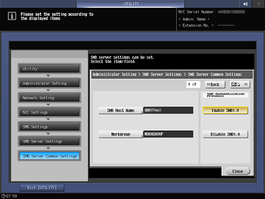 Control panel - Utility/Counter - [Administrator Setting] - [Network Setting] - [NIC Settings] - [SMB Settings] - [SMB Server Settings] - [SMB Server Common Settings]