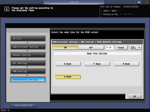 Control panel - Utility/Counter - [Administrator Setting] - [Network Setting] - [NIC Settings] - [SMB Settings] - [WINS/NetBIOS Settings]