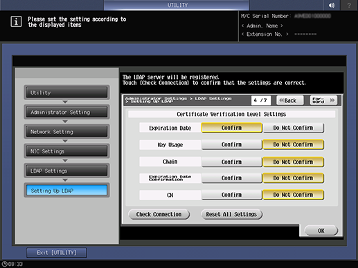 [Check Connection] | Checks connection with LDAP server. This is displayed if [Enabling LDAP] is [ON]. |