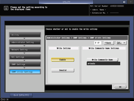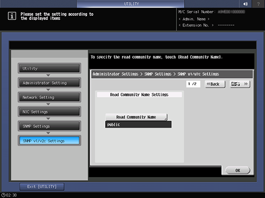 Control panel - Utility/Counter - [Administrator Setting] - [Network Setting] - [NIC Settings] - [SNMP Settings] - [SNMP v1/v2c Settings]