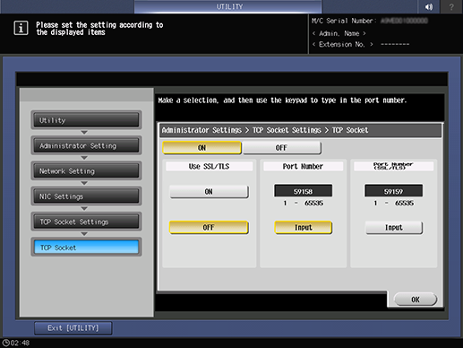 Control panel - Utility/Counter - [Administrator Setting] - [Network Setting] - [NIC Settings] - [TCP Socket Settings] - [TCP Socket]