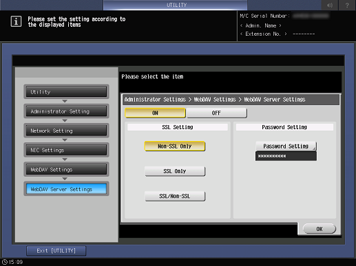 Control panel - Utility/Counter - [Administrator Setting] - [Network Setting] - [NIC Settings] - [WebDAV Settings] - [WebDAV Server Settings]