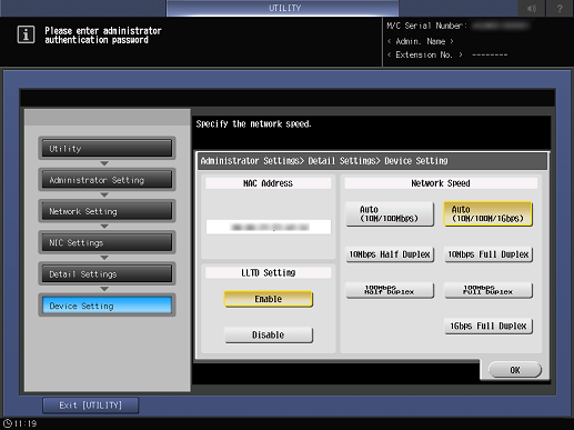 Control panel - Utility/Counter - [Administrator Setting] - [Network Setting] - [NIC Settings] - [Detail Settings] - [Device Setting]