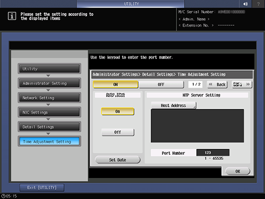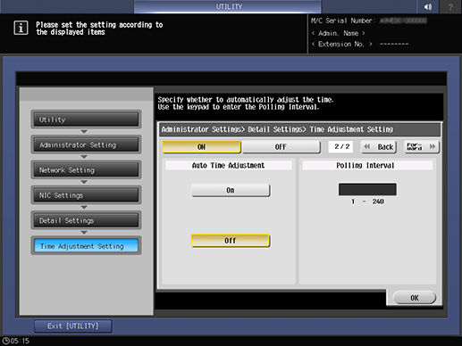 Control panel - Utility/Counter - [Administrator Setting] - [Network Setting] - [NIC Settings] - [Detail Settings] - [Time Adjustment Setting]