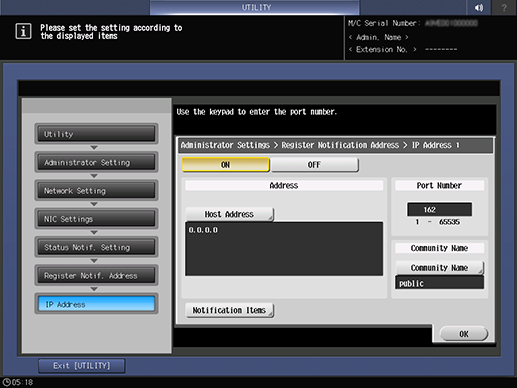 Screen access | Control panel - Utility/Counter - [Administrator Setting] - [Network Setting] - [NIC Settings] - [Detail Settings] - [Status Notification Setting] - [Register Notification Address] - [IP Address 1] | |||