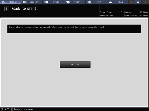 Screen access | Control panel - Utility/Counter - [Quick Security Setting] - [Administrator Password] | ||