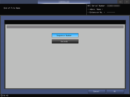 Control panel - Utility/Counter - [Administrator Setting] - [Scan Setting] - [Scan Details Setting] - [End of File Name]