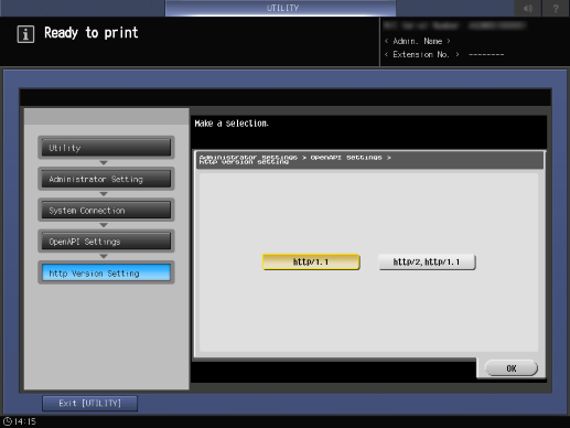 Control panel - Utility/Counter - [Administrator Setting] - [System Connection] - [OpenAPI Settings] - [http version setting]