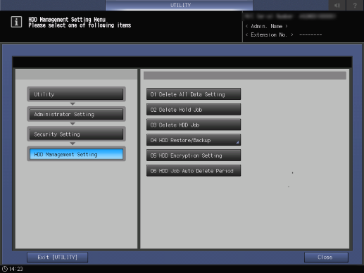 Control panel - Utility/Counter - [Administrator Setting] - [Security Setting] - [HDD Management Setting]