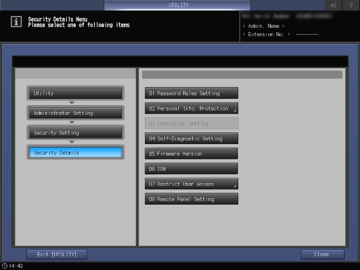 Control panel - Utility/Counter - [Administrator Setting] - [Security Setting] - [Security Details]