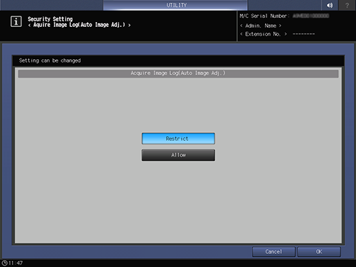 Control panel - Utility/Counter - [Administrator Setting] - [Security Setting] - [Acquire Image Log(AutoImage)]