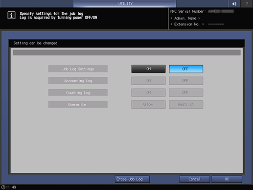 Control panel - Utility/Counter - [Administrator Setting] - [Security Setting] - [Job Log Settings]