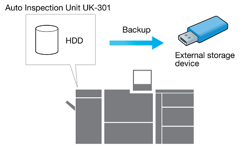 Back up data (reference images and automatic inspection reports) in the Auto Inspection Unit UK-301 HDD to a USB external storage device.
