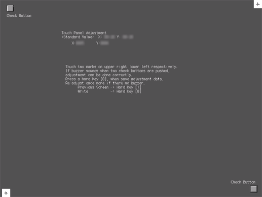 Setting items | Cross mark (Two locations) | Sounds the buzzer, and displays the coordinate value on the Touch panel. | |