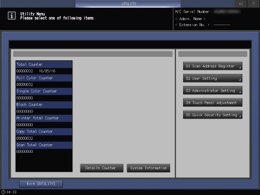 Screen access | Control panel - Utility/Counter - [Touch Panel Adjustment] | ||