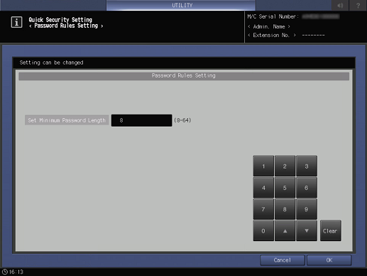 Screen access | Control panel - Utility/Counter - [Quick Security Setting] - [Password Rules Setting] | ||