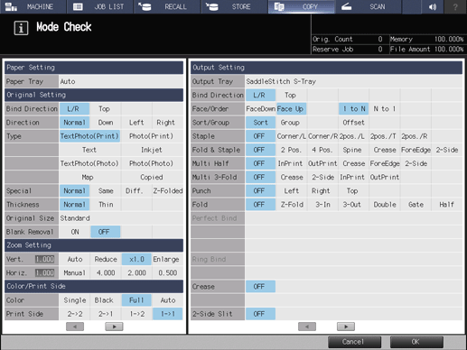 For the [STORE] screen or [SCAN] screen, press [Close] after checking the job conditions.