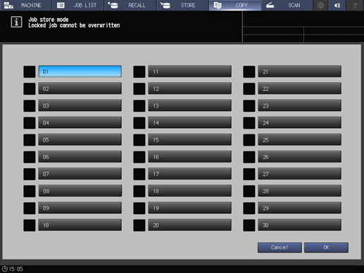 [OK] | Registers the settings based on the checked job conditions. Then, select the number to be registered. | |||