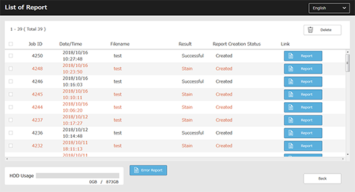 [Completed Job] | Report of printouts that satisfy the inspection level. A report of up to 1,000 pages can be created. A report is created in PDF format. If the number of pages exceeds 1,000, they are divided into different files, which are created as PDF files. |