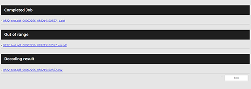 This displays the screen for checking [Completed Job], [Out of range], or [Decording result].