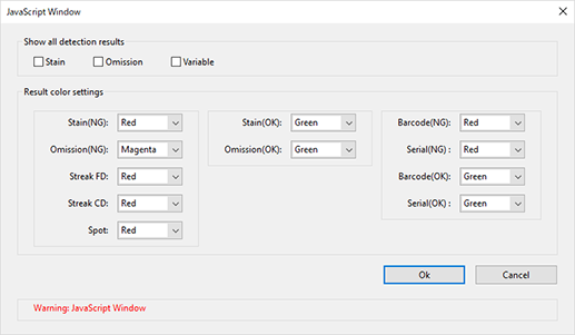 [Result color settings] | [Stain(NG)] | Sets the color of the frame to enclose image failures such as stains, omissions, streaks, or spots. |