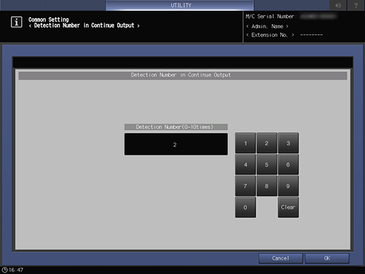 [Detection Count] | Sets the number of deviations or non-standard images detected before printing is stopped while [Continue Output] is selected. Available range: 0 to 10 (Default: 2) | |||
