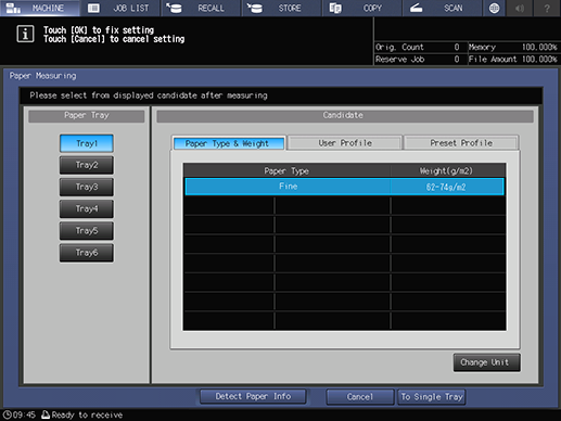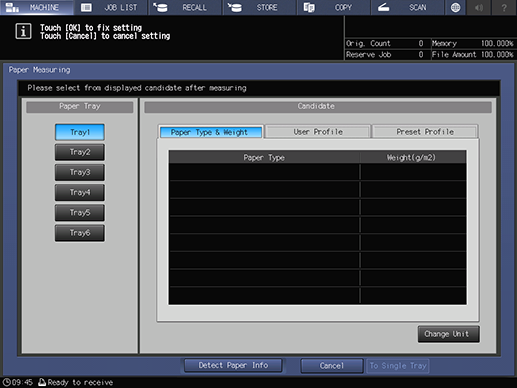 The measurement result is reflected in the [Paper Tray] field on the [MACHINE] screen.