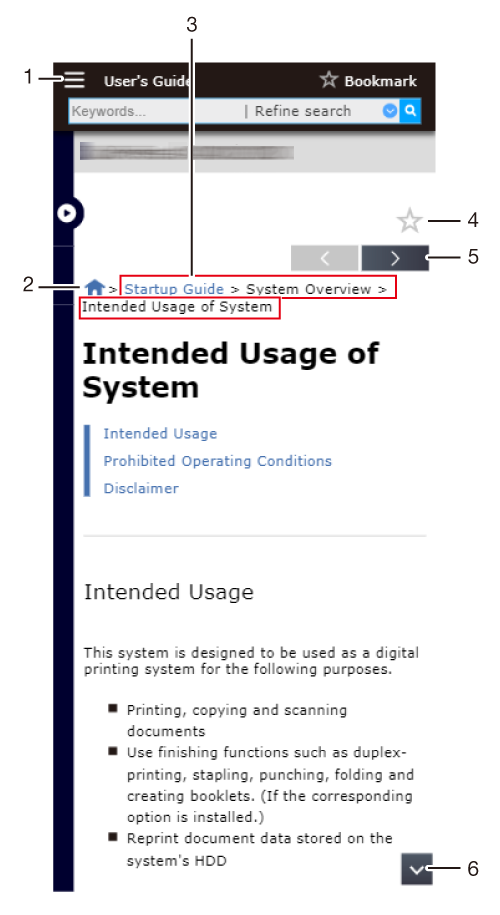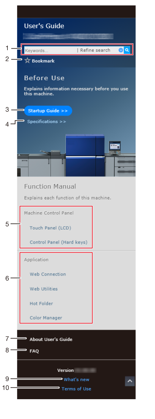 1 | Search field | Used to search for the entire User's Guide using any keyword. Using the Refine search function allows you to further filter the search result. For details, refer to Using the Search Function. |