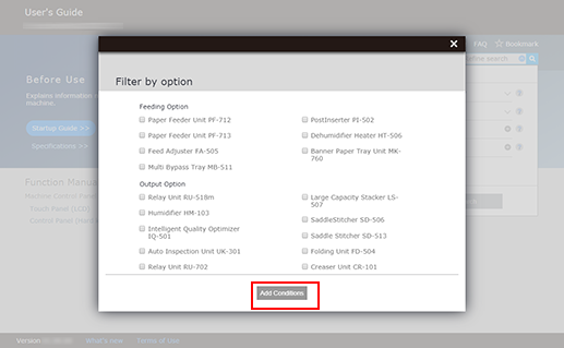Clicking or tapping [Filter by option] displays a modal window that enables you to select an option. Select the check boxes of the items you want to include in the search range, and click or tap [Add Conditions]; the items are set as search conditions.