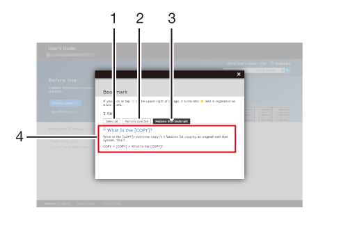 4 | Bookmark | Displays the pages registered in Bookmark. Clicking or tapping a page title displays its page. Select the check box of the target page, and click or tap [Remove from bookmark]; the page is removed from Bookmark. |