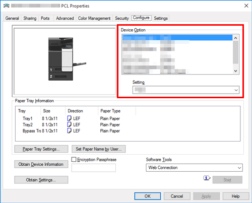 By default, [Auto] in [Obtain Settings...] is enabled. The information on this machine is automatically obtained and reflected to [Device Option].