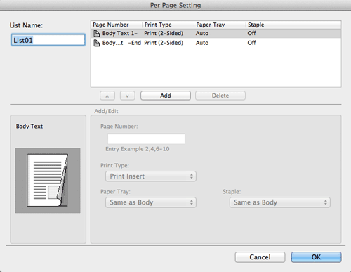 Create in advance a list that specifies the paper and print settings for each page. When printing on inserted paper, select the list you want to apply to printing.