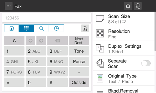 [Outside]: Insert an outside line number ([E-] is displayed) when connecting this machine to PBX (private branch exchange). This option is displayed when [PBX Connection Setting] (Here) is set.