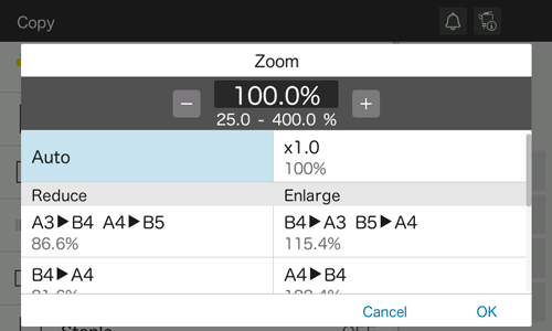 Fixed Zoom | Select a preset zoom ratio when copying a standard-size original onto standard-size paper. The paper tray is automatically exchanged depending on the selected zoom ratio. |