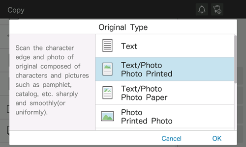 [Text/Photo - Printed Photo] | Copies the original, which consists of text and photos, at the optimum level of image quality. This function sharpens the edges of each character and reproduces smoother photos. Select this option to scan printed originals such as brochures and catalogs. |