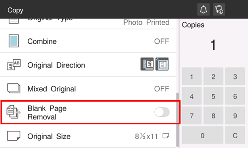 When [Blank Page Removal] is specified to scan an original including blank pages using the ADF, blank pages are excluded from scan targets. Blank pages detected are not counted as original pages.