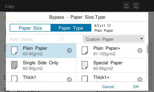 The available paper type varies depending on the paper tray, so the displayed screen is different. For details on the available paper, refer to Here.