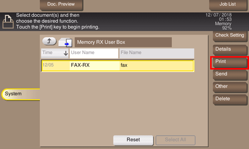 When you print a fax, it is deleted from the Memory RX User Box automatically.