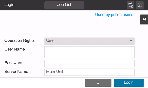 If Public User Access (unregistered users) is enabled, you can tap [Used by public user] on the login screen to operate this machine without authentication.
